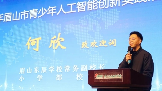 眉山东辰学校常务副校长、小学部校长何欣在闭幕式上致欢迎词。作为活动承办方代表,何校长对赛事的圆满举办表示热烈祝贺,高度肯定参赛选手展现出的科创风采与拼搏精神,并寄语广大青少年保持好奇、勇于探索,在科技创新道路上不断追光前行。